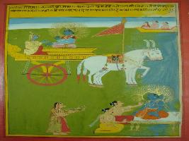 | Description / विवरण | Miniature painting based on Shri Bhagwat Gita. It depicts Krishna preaching Arjun that one who is low born such as woman shudra, Vaishya, could get paramgati if he or she comes under His shelter. |