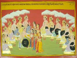 | Description / विवरण | Miniature painting based on Mahabharat - Rajdharma parva depicting kings sitting in court for the Swayamvar of Princess Chitragada. She is shown coming to court with her friend to choose his husband. Duryodhan rose from his seat and went toward her and hold her hand. |