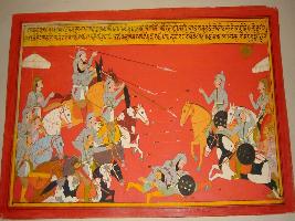 | Description / विवरण | Miniature painting based on Prithviraj Raso depicting Panga telling his army to fight with trick as he wants to kill Baghrav Badhela for his win. |