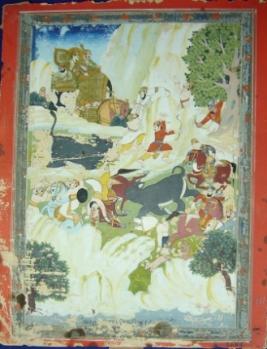 | Description / विवरण | Miniature painting depicting a prince with his companions hunting buffalo, rabbits and deers in jungle. |