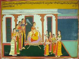 | Description / विवरण | Miniature painting based on Mahabharat - Virat parva. Here queen Sudeshna is depicted surrounded by many maids and she is depicted sitting on a throne. |