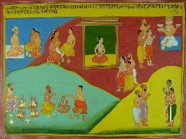 | Description / विवरण | Miniature painting based on Mahabharat - Adi parva depicting Brihgu cursing Agni, after that Agni pledged Devtas and Brahma for help. They asked Agni about curse and consoled him. |
