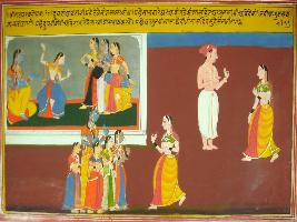 | Description / विवरण | Miniature painting based on Mahabharat - Virat parva. Arjun is depicted teaching dance to Uttara and she is depicted dancing. On the lower part Arjun is the guise of Vrihnalla is depicted with four women. |