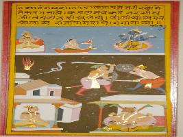 | Description / विवरण | Miniature painting based on Sarangadhar, At the upper part lord Vishnu is depicted and Indra and a Devta sitting in front of him. At the centre two men are fighting and a snake is coming towards them. Narasimha is killing Hiranyakashyap with his claws at the lower part. |