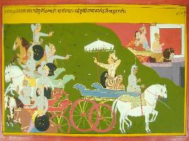 | Description / विवरण | Miniature painting based on Mahabharat - Rajdharma parva depicting Duryodhan is fighting and then moves with his wife to Hastinapur. |