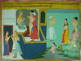 | Description / विवरण | Miniature painting based on Mahabharat - Virat parva. The persons depicted praying the king Virat. king Virat is depicted with queen. People here depicted closing their face when they see Draupadi knowing that her husband killed Kichak. Draupadi is depicted bathing in the river as other man touched her. |