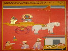 | Description / विवरण | Miniature painting based on Shri Bhagwat Gita depicting Krishna preaching Arjun that even if a bad man prays me for at least once a day he can become saint. |