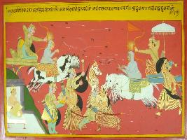 | Description / विवरण | Miniature painting based on Mahabharat - Rajdharma parva depicting fighting between Jarasandha and Karna. They fought with arrows, swords, mace and finally with hands. |