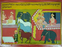 | Description / विवरण | Miniature painting based on Mahabharat - Udyam parva depicting Sanjay telling Dhritrashtra about the arrival of army of Virat and Jarasandha s son Bristhketu, separately in the battle field. |