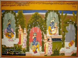 | Description / विवरण | Miniature painting based on Geet Govind depicting Krishna and Radha the painting says that Radha come to Krishna place with her friend and later her friend left Radha with Krishna and Radha and Krishna and seen in loving union at the upper left corner. |