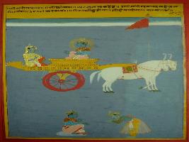 | Description / विवरण | Miniature painting based on Shri Bhagwat Gita. It depicts Krishna preaching Arjun that one who get rid of boundaries of Karma and worldly desires, he is will get him. |