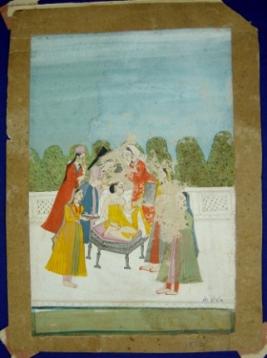 | Description / विवरण | Miniature painting based on Ragini Bilawal depicting Ragini getting dressed by her attendants. She is sitting on a chauki. |