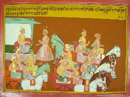 | Description / विवरण | Miniature painting based on Mahabharat - Udyam parva depicting Indra gave horse to Nakula, the son of Madri. Later Nakula is depicted coming with Abhimanyu in the battle field in the horse. |