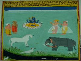 | Description / विवरण | Miniature painting based on Kalila Damana depicting Lord Vishnu in the centre, Who is preserver of this world. Nearby Men are shown with folded hand who is worshipping him. Animals such as elephant, horse Swan and fish is depicted at lower part to show that God had created them. The painting shows Mughal influence. |