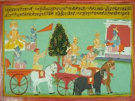 | Description / विवरण | Miniature painting based on Mahabharat - Udyam parva depicting Duryodhan asking about the Arjun s chariot, then Sanjay said that gods has blessed Arjun with Chariot. Whose flag is loftiest and which can move anywhere without being stopped. |