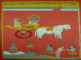 | Description / विवरण | Miniature painting based on Shri Bhagwat Gita. It depicts Krishna preaching Arjun that peoples who penance, performs yagna, mediates all are done for him only. |