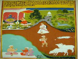 | Description / विवरण | Miniature painting based on Kalila Damana depicting merchant saying that people who have less intelligence and more greed, he can live his life on the donation of others, same as a lion hunts and jackals eats the residues. |