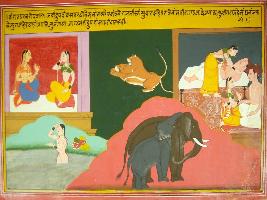 | Description / विवरण | Miniature painting based on Mahabharat - Virat parva depicting Draupadi is taking bath to purify herself since Kichak touched her. Then she goes to queen and shown sitting and telling her about Kichak s behaviour at upper right part. At right, she is going to Bhim and wake him up from sleep. She is telling everything about the incident with Kichak. Her waking up Bhim is compared with deer waking up lion and cow making up elephant. |