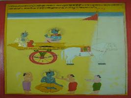 | Description / विवरण | Miniature painting based on Shri Bhagwat Gita. It depicts Krishna preaching Arjun that if some one worship him with Patra, Pushpa, phal and jal, he would fulfil his wishes. |