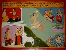 | Description / विवरण | Miniature painting based on Harivansha depicting that Parvati telling Indra s wife that a woman who takes bath in pond, river, well and with water in pitchers by the permission of her husband and who worships cow with her husband, then her wishes will be fulfilled. |