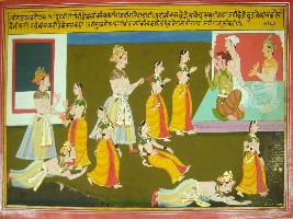 | Description / विवरण | Miniature painting based on Mahabharat - Virat parva depicting Draupadi going to palace of Kichak with wine. Kichakis giving her seat and teased her. He is shown pulling her hair, and Draupadi got angry and told him that this husband would take revenge for his behaviour she left place. |