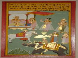 | Description / विवरण | Miniature painting based on Sarangadhar. On the upper part depiction of a king and three men. In the lower part a man with horse and an elephant rider are depicted with two women. |