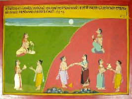 | Description / विवरण | Miniature painting based on Harivansha depicting a woman pouring milk over rice and mixing it at the upper right part. At the lower right, she is shown giving a vessel to a Brahman. In the left, she is shown giving coins to a needy person. At the lower left, she is shown giving a golden pot to a person. Above it, she is shown sitting alone. |