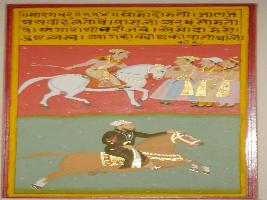 | Description / विवरण | Miniature painting based on Sarangadhar. On the upper part a horseman is depicted charging on three men, in the lower part a man is depicted riding a horse. |