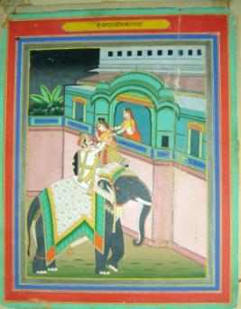| Description / विवरण | Miniature painting depicting Raja Ram Singh ji eloping a queen. He is sitting on elephant back. An attendant is helping the queen to elope. |