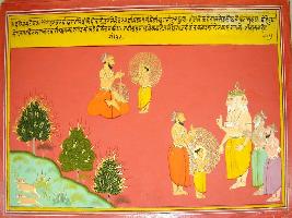 | Description / विवरण | Miniature painting based on Harivansha depicting Agni putra with a sage and on the left side Agni putra is standing with Lord Brahma and other deities. |