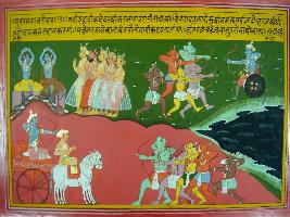 | Description / विवरण | Miniature painting based on Mahabharat - Udyam parva. The painting depicts the devotees like Indra, Brihaspati and Agni etc, While on the other part of the painting depicts the fighting scenes of Arjun with demon.This is told by Sanjay in the court of Kauravas, not to fight with Pandavas. |
