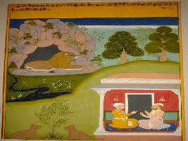 | Description / विवरण | Miniature painting based on Kalila Damana depicting Kalila asking Damana to tell him about what he has decided. |