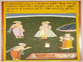 | Description / विवरण | Miniature painting based on Sarangadhar. In the upper part, two men and a woman are standing around a fire. In the lower part a man is lying and another man is bending to him in namaskar mode. |