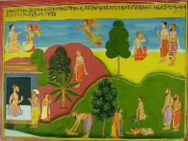 | Description / विवरण | Miniature painting based on Mahabharat - Adi parva depicting sage Pulkesh finding the baby daughter of apsara Menaka and taking her to his ashram. It also depicts apsaras flying in the sky. |