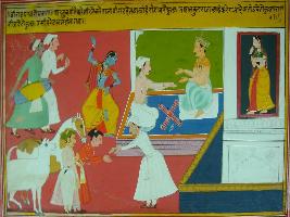 | Description / विवरण | Miniature painting based on Mahabharat - Virat parva. This painting depicted, Pandavas is spending their 13th years of exile in Virat kingdom Arjun shown dancing and singing at upper right part. To their left Yudhisthir is shown playing chopar with king and queen is show coming. Nakul and Sehdev are shown keeping horses and cows. They spend 10 months peacefully. |
