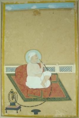 | Description / विवरण | Miniature painting depicting king Ranjit Singh of Bharatpur with a halo behind the head. He is seated on a couch and smoking hookah. |