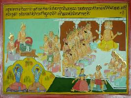 | Description / विवरण | Miniature painting based on Mahabharat - Udyam parva. It depicts Bhishma telling Arjun that one day all gods and sages reaches to Brahma and they together go to Vishnu. |