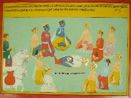 | Description / विवरण | Miniature painting based on Mahabharat - Rajdharma parva depicting Krishna with Pandavas and other warrior coming forward and Bhishma who is lying on arrow of bed. They are shown surrounded Bhishma. |