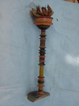 | Description / विवरण | This is a decorative object, which is having two lotus carved in wood on stand. The stand has a circular base and a decorated shaft. It is also painted. |