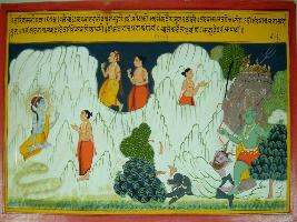 | Description / विवरण | Miniature painting based on Harivansha depicting the demon Andhar and his army charging on Meru mountain. Mandara is seen going away to ask the help of seated Mahadev. Some rocks have fallen over the demons. |