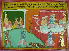 | Description / विवरण | Miniature painting based on Mahabharat - Udyam parva. Sanjay says to Dhitrastra about Narakasura who won the sen of Prithvi and killed by Krishna while on the painting Pandavas one seen that talking with Yudhisthir. |