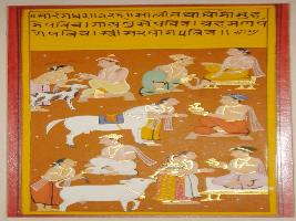 | Description / विवरण | Miniature painting based on Sarangadhar depicting a king donating alms and goat to a man, washing the feet of a Brahman, giving riches and a horse to a man, donating cow to a Brahman and riches to a couple. |