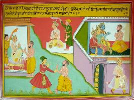 | Description / विवरण | Miniature painting based on Harivansha depicting the story of rivalry between king Dhrupad and Dronacharya and Arjun won the state of Dhrupad for Drona as guru dakshina. |