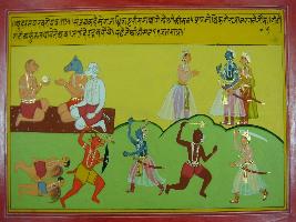 | Description / विवरण | Miniature painting based on Mahabharat - Udyam parva. The painting depicts Krishna who is fighting with demon while Sanjay says in the Hastinapur court that Krishna alone killed 8 thousand demon. |