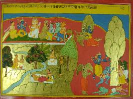 | Description / विवरण | Miniature painting based on Mahabharat - Adi parva depicting Devtas like Indra, Vishnu, Shiv and demons discussing with Brahma about the Samudra manthan. The right part depicts the process of Samudra manthan. |