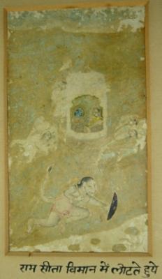 | Description / विवरण | Miniature painting depicting scenes from Ramayana where Ram and Sita are flying on Viman and Hanuman is flying along with them who is holding mace and a shield. |
