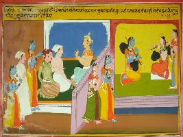 | Description / विवरण | Miniature painting based on Mahabharat - Virat parva depicting Arjun coming in guise of women to the court of Virat and is given job of teaching dance and music to king s daughter Utra. At the left part, Arjun is shown coming and teaching Utra music. |