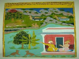 | Description / विवरण | Miniature painting based on Kalila Damana depicting Kalila talking to Damana at the lower right part and two men are shown sitting in a place and discussing. At the upper part, Kalila and Damana is shown sitting with other animals like Stag, Deer, Donkey in front of Lion in a forest. Painting shows Mughal influence. |