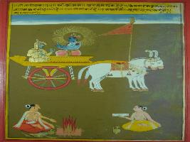 | Description / विवरण | Miniature painting based on Shri Bhagwat Gita. It depicts Krishna preaching Arjun that those people who does yagna, upasana, earn gyan they are loveable to me. |
