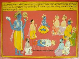 | Description / विवरण | Miniature painting based on Mahabharat - Rajdharma parva depicting Bhishma paying homage to Krishna and praising his vishwaroopa. Then Krishna says that he has shown this vishwaroopa because of the bhakti of Bhishma. Other Pandavas and Narad is seen sitting around Bhishma. |